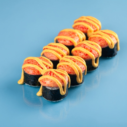 Рис SHINAKI, нори, сливочный сыр, жареный норвежский лосось в унаги соусе, тамаго блинчик, сырная шапка, унаги соус. 1 порц= 8шт *В составе шапочки присутствует молотый чеснок